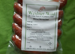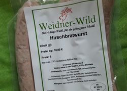 Für unsere Wurstvariationen werden das Muskelfleisch und das Fett vom ganzen Rothirschen grob oder fein, individuell nach Wurstsorte, gekuttet. Das so entstandene Brät wird mit diversen Gewürzen verfeinert und anschließend in Naturdärme gefüllt. Je nach Herstellungsverfahren unterscheidet man zwischen Rohwurst oder Brühwurst, wie zum Beispiel unsere Hirschbratwurst. Die meisten unserer Würste, wie unsere Hirschpeitschen, bieten wir jedoch roh an, um das beste Geschmacksergebnis zu erzielen.